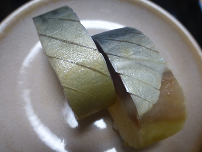 鯖寿司。肉厚の鯖、甘めの酢飯で美味しい。 |