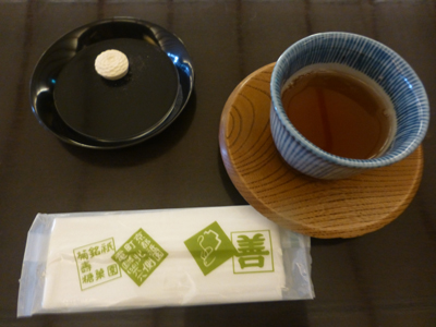 お茶とともにお干菓子が運ばれてくるのが特徴。おしるこを注文。 |