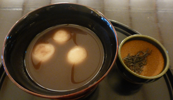 おしるこ。右は、後口のための塩昆布。くずきりがメインメニューだが、冬季限定メニューのうち、きび餅ぜんざいは以前いただいたので、もう1つの冬季限定メニュー、おしるこをいただいた。 下 美味しいおしるこで温まった。 |