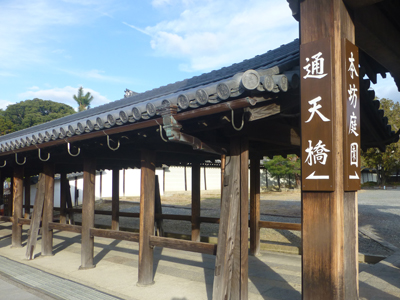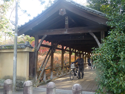 いったん南の出口から外に出た。南の出口の横に、観光客の出入りには使われない門がある。勅使門だ。戦乱時の矢の跡があるらしいが、近寄れず確認はできない。歩いてきた方向を撮影。逆向きにまた歩きはじめる。 |