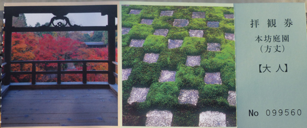 まず通天橋、そのあと本坊庭園に向かうことにする。下 通天橋の入口で拝観券を買うと、通天橋の半券を切って渡された。 |