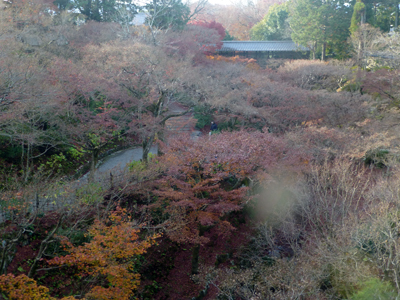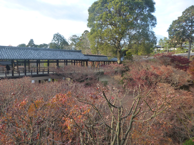 臥雲橋から境内にある通天橋を見る。完全に見ごろを過ぎて、くすんだ色で、かなり落葉している。 |