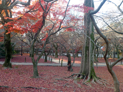 通天橋が地上にある区間の近くにて。かなり枯葉が散って、地面が枯葉で埋まってきれいだ。 |