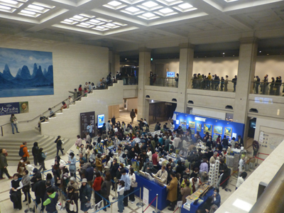 上 館に到着。列ができているが、入場券を買う列だろう。建物内にも列が続き、20分ほどかかりそうな列だったので、ネット購入しておいてよかった。左 券のある人は2階へということだが、入場の列ができていた。列は3階に続き、20分ほど並んだ。入場できたのは11時を回っていた。(撮影は見学終了後) |