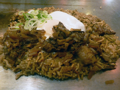 ぼっかけそばめし。目玉焼きのせ。 |