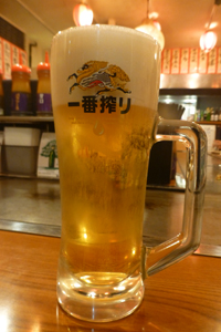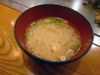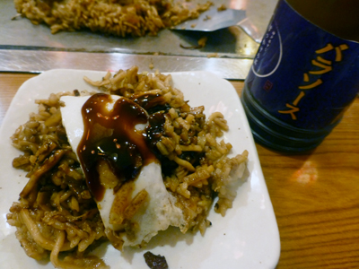 そばめしを拡大。細かく切った焼きそばが焼きめしに混じっている。下左 生ビール。 下右 昼食時はサービスで味噌汁がついた。 |