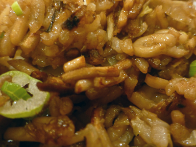 へらで小皿にとり、ソースをかけていただく。ソースは、旨辛、バラ、甘口とあり、3種試したあとは、バラをかけた。バラは辛さは中間だが、酸味がきいていて、食欲がわく。 |