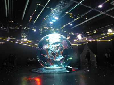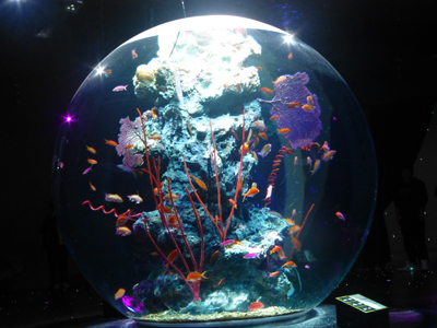 小さい魚が泳ぐ球体。 |