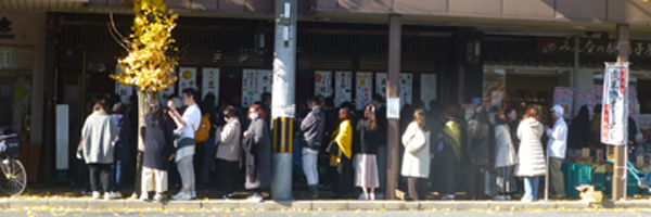 京阪・出町柳よりスタート。自宅を出る前にぐだぐだしてしまい、7か月ぶりに、和菓子店"ふたば"の列に並べたのは10時40分ごろ。以前は。店の前の列が長くなると、交差点を渡ったあたりから、列が続いていたが、今回は交差点からかなり東寄りの場所から列が始まっていた。ほかの店の前で並ばせるのに、別の店からの苦情があったのだろうか。 |