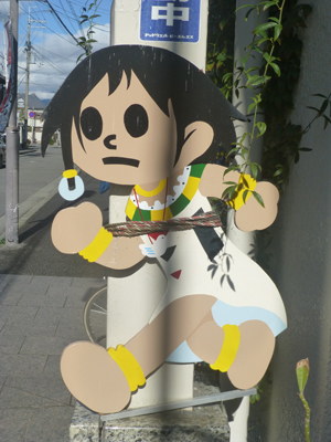 京都ではそれほど見かけない"飛び出し坊や"が、商店街の出口にいた。少し独自バージョンだが。 |