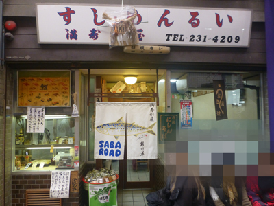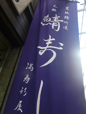 鯖寿司ののぼり。並んでいる間にこの店の口コミなどをネット検索すると、鯖寿司が美味しいというのものが多数。 ただ鯖寿司は1人前3000円と悩む。それで、鯖寿司うどんセット1200円に決めた。 |