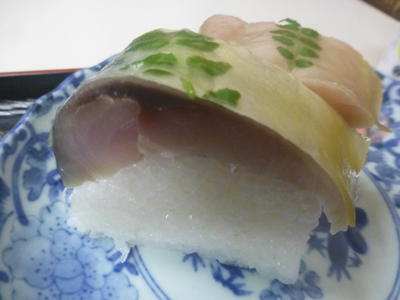 鯖寿司2切れのうち1切れは肉厚の鯖を使っている。実にうまい。 |