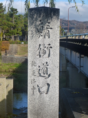 出町商店街を出て、京大博物館に向かう。鴨川デルタに差し掛かるところに「鯖街道口」の碑がある。 碑にかかっている枝は柳。たまたまだろうが、"出町柳"というだけある。 |