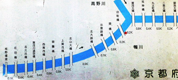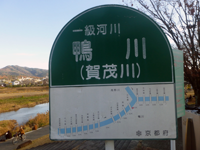 橋の西詰の北側に「鯖街道口」碑があるが、南側には鴨川の看板があった。賀茂大橋より北は普通は「賀茂川」とするが、土木行政では「鴨川」で通しているのかもしれないな。 |