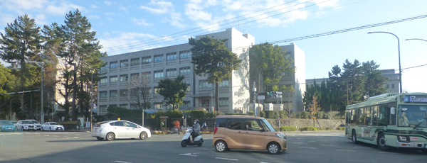出町柳駅に戻り、さらに東へと向かう。下 百万遍交差点。南東角の京大の建物群を見る。 |