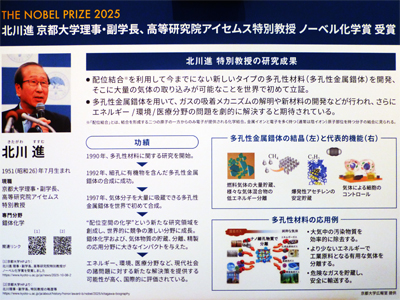 最初に、ノーベル賞の特設コーナーがあった。化学賞、北川進さんの業績展示。 |