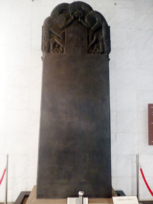 大秦景教流行中国碑(複製)。写真では文字がよく見えないが、ぎっしりと文字が彫られている。景教(ネストリウス派キリスト教)の教義を漢字・シリア文字で彫ってある碑。781年、長安の大秦寺に建立。1907年、西安碑林に移された際、世界各地に複製が寄贈された。日本には2点寄贈され、そのうちの1点。 高校の世界史教科書で写真が掲載されていて、西安の碑林博物館は1994年に行き、そのときに本物を見ているので、とても印象的だ。 |