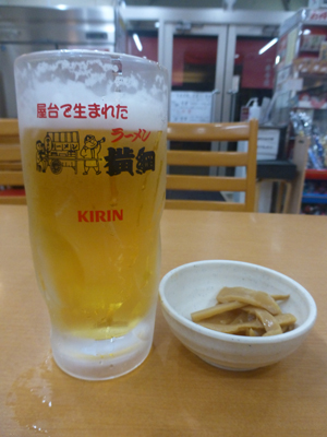 生ビール。つまみにメンマがついていた。 |