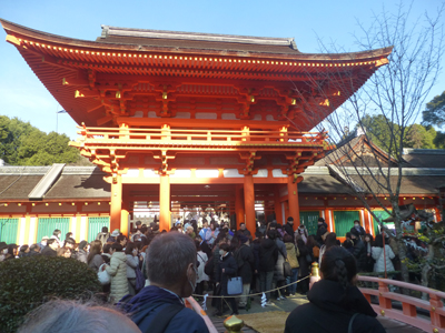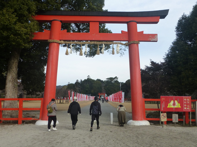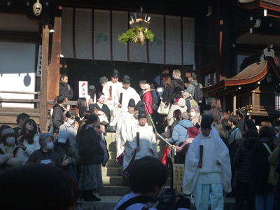 神事が終わった後で、参拝できるようになり、楼門の中に入った。階段を上り、参拝。元日から5日までなら、普段は特別料金が必要な本殿参拝ができるらしい。 |