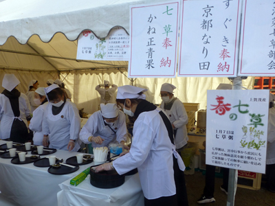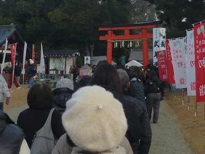 参道の途中に長い列ができていた。七草粥の列に違いないと並ぶ。 |