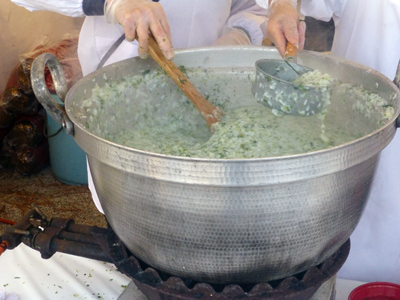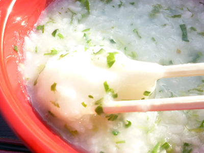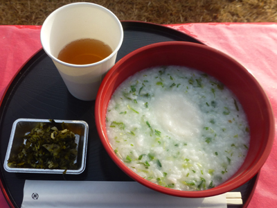 20分ほど並び、500円払い、券を買い、券を渡して粥を受取る。 |