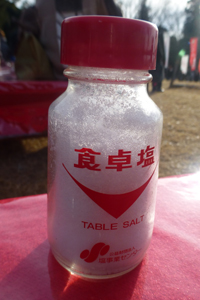 食事場所へ行き、いただきま〜す。下左 餅が入っていた。七草は細かく刻んである。 下右 味が薄いので。席には塩がおいてある。塩もかけたけど、味がうすくて食べにくかった。 |