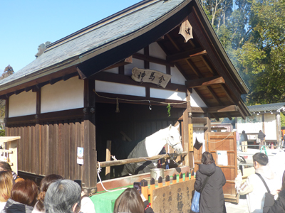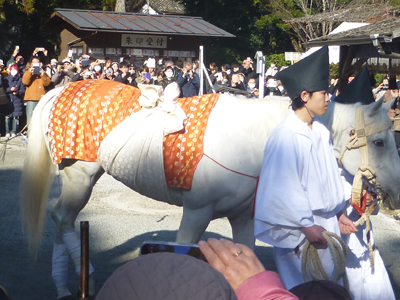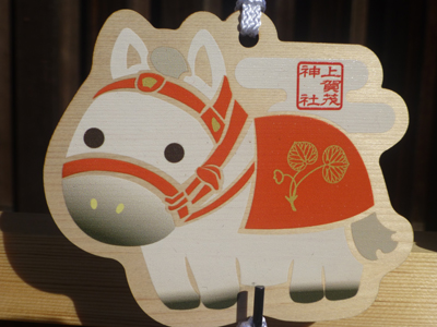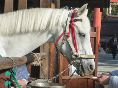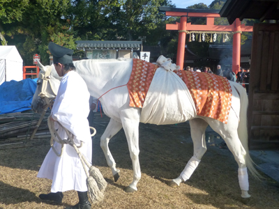 神馬(しんめ)舎に行くと、神事のために神馬が出陣するところだった。上賀茂神社の神馬は、もとは競走馬の白馬。今の名は「神山号」。普段は京産大の厩舎にいて、日を決めて上賀茂神社に出陣している。 |