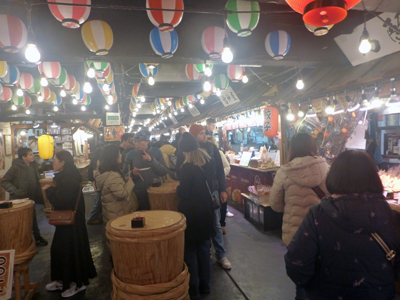 錦は約2年ぶりなのだが、この間に、屋台村のようなところが何ヶ所かできていた。2年前には、こんなにたくさんなかった。インバウンドの食べ歩きが問題になって、食べ歩き防止のために設置されたのだろう。 |