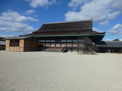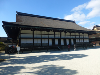 紫宸殿。御所で最重要な建物で主要な儀式が行われる。平安時代からあるが、現在の建物は1855年改築のもの。春秋に5日間ある特別公開の際、階段の下まで行けるのだが、今回は一般公開で中庭の東南の隅から見るだけ。 |