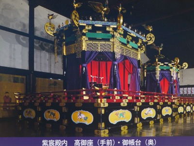 (展示パネルの写真を拝借)紫宸殿内には高御座(たかみくら)があり、特別公開の際は、紫宸殿の前面が開放されて、見ることができる。(高御座は、今上天皇の即位の礼のさいには、解体されて東京に運ばれ、使用された。)一般公開では見られず、写真のみ。 |