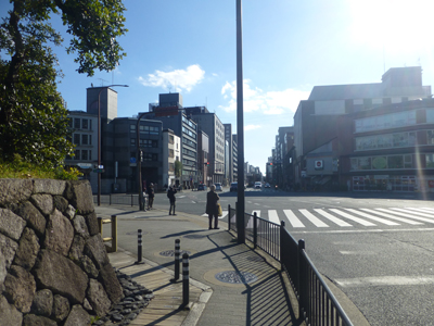 烏丸丸太町で、北東側から南を見る。烏丸通が東へ数m寄っていることがわかる。烏丸通が少し曲がるのは東本願寺の前が有名だが、ここも曲がっている。 |