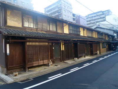 押小路通りを西に進む。古い住居が残っていた。背後には高層マンションが並ぶ。(京都は高さ規制があるので、高層といっても、最高で11階建て程度。) |