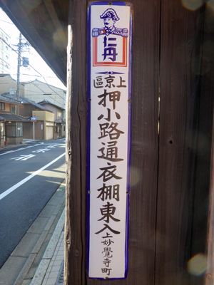 仁丹の古い住所表示の看板が残っていた。注目点は、上京区と書いてあること。現在は中京区である。かつて、京都市の都心部は、御池通を境に上京区、下京区に別れていたが、昭和4年に、上京区の丸太町から南、下京区の四条通から北を合わせて中京区ができた。だからこの看板は昭和4年より前のものだ。 |