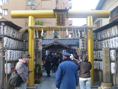 御金神社。金運を祈る神社で、鳥居は金色。お金を洗い、お守り代わりの財布を買って、そこに洗ったお金を入れるといいらしいのだが、前回きたときは、そのことを知らなかったので、今回は、それをしようと思った。でも、1時間ほど並ばねばならないような参拝客の列ができていて、別の機会に出直すことにした。 |