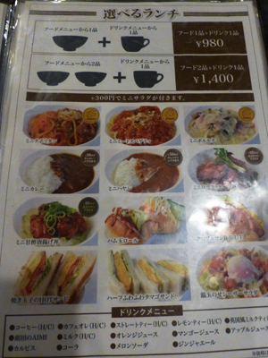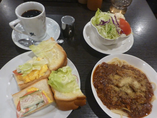 「選べるランチ」は、フード2種類、飲物、サラダで1700円。フードは、ミニミートスパゲティ、焼き玉子のHOTサンド、飲物はコーヒーにした。 下 注文品。HOTサンドは、上のパンを外した状態。 食べた時間が遅く、昼夕兼用の食事になり、晩御飯はたべなかった。 |