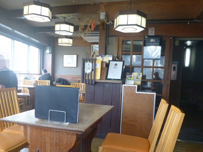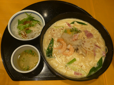 冬のおすすめと案内されている「海老と湯葉と聖護院蕪おろしのクリームスープ」という和風のスープパスタにした。大盛、サラダ、飲物がついたセットがお得な感じでセットを注文。 |