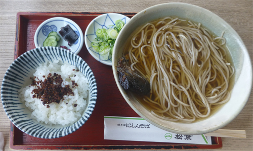 にしんそば(にしんしぐれご飯つき)を注文。にしんは、温めるため、出汁につかっていて、見た目は素そばみたい。 |