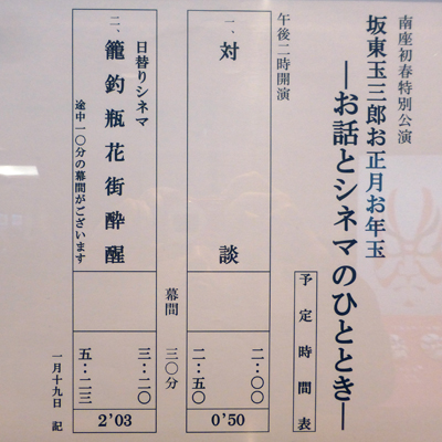 1月10日に十日ゑびすに行ったさい、南座の前で「坂東玉三郎お正月お年玉ーお話とシネマのひととき」という公演がその日が初演という看板を見た。それで、その公演をみたくなり、19日の券をネットで購入。 |