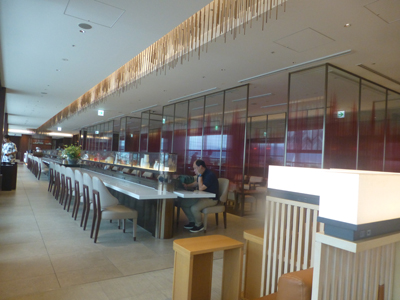 往路は、JAL株優利用。2階のJGC用カウンターで荷物を預け、専用保安検査場へ行くと長蛇の列。一般の検査場のほうが早く通過できそう。そのあと、サクララウンジに向かったのだが、何と、DP(ダイアモンドプレミア)ラウンジを案内された。単に間違えたのか、多客のため緊急措置をとったのか。後者ならすばらしい判断だ。 |