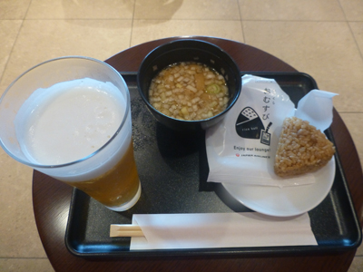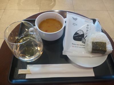 数年前までの10年間、JALの上級会員資格でJGPだった。その当時はDPラウンジが利用できたが、数年前からはその資格がなくなり、JALではサクララウンジ利用になった。今回、久ぶりにDPラウンジが利用できてラッキーだった。ビールこそ、サクラと同じだが、おにぎりとみそ汁はDPにしかない。 |