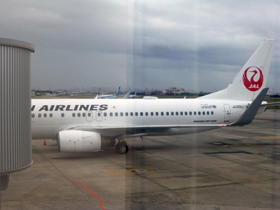 ボーディングブリッジの途中から見た搭乗機。B738(B737-800)。 |