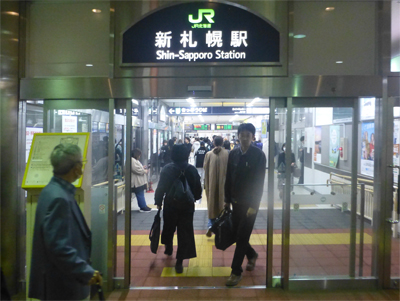 新札幌駅は商業ビルと一体になっていて、駅舎がはっきりしない。写真は駅から出たところ。駅から出ると、2階の通路なのだが、雰囲気は地下通路のような感じ。 |