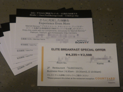 ウェルカムギフトはポイント、バー利用券もあったが、レストラン割引券10ドル(1500円)分にした。ほかに、エリート会員向け朝食割引券を渡された。この券で、朝食は2500円で、さらに10ドル割引券を使えば1000円になるという。 |