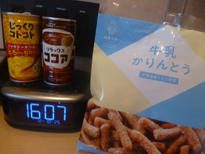 さらにサービスとして、フロントで菓子を渡され、ベッド横に飲物がおいてあると言われた。菓子はチェックイン時だけだったが、飲物は、ココアとコーンスープで、毎日置かれたので、びっくりした。 |