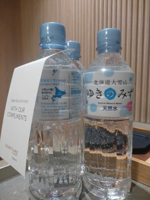 上左 缶飲料はベッド横の両側に置かれた、温める装置に入っていた。上右 水は3本で、使った場合は、毎日、3本になるように置かれていた。 左 部屋の中。入ると暖房が入っていた。今シーズンの初暖房。室温の調整もできた。 |
