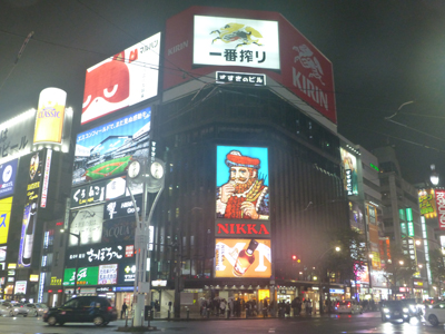 3時間ほど部屋で休み、夕食のため外出。雨はやんでいて、すすきのまで歩く。15分ほど。写真は、すすきの交差点。 下 交差点では路面電車が行きかう。 |