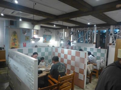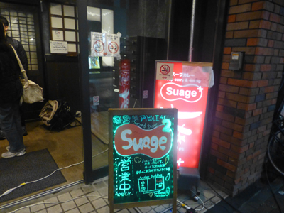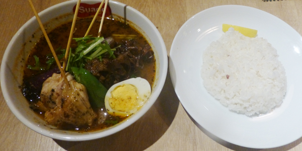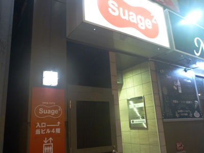 ネット情報を見て、夕食はスープカレー店「Suage」でとることにしていた。まずビル2階にある本店に行くと、階段に列ができていた。ビル1軒おいたところの2号店へ。 |