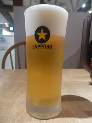 40分ほど待ち、席に案内された。まず、生ビールが運ばれてきた。下 注文していた「バリバリ知床鶏と野菜カレー」も運ばれてきた。 |