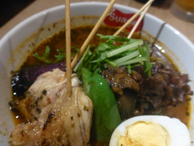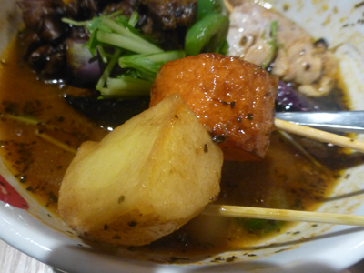 じゃがいも、にんじんも串に刺されていて、やや大きめ。緑のは、ピーマン、ブロッコリー、水菜、かいわれ。カレーは中辛にしたが、やや辛めで、ちょうどよかった。美味しいスープカレーだった。 |