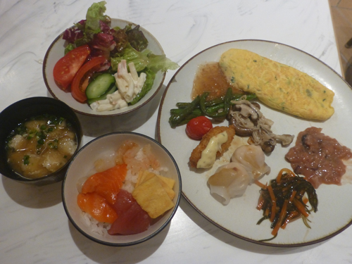 選んだビュッフェ。焼いてもらったオムレツは右上。ご飯はミニ海鮮丼に。 |